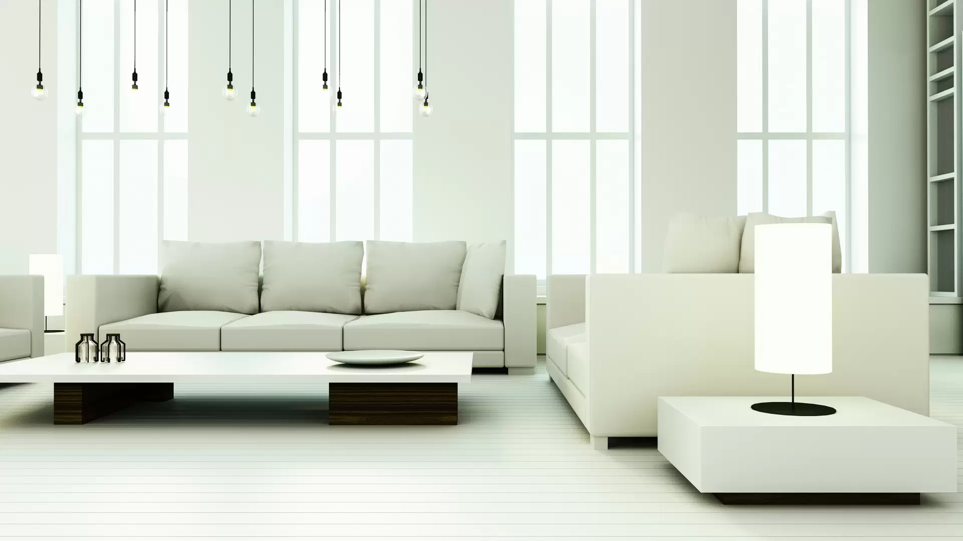 Интерьер обычно выполняется в нейтральных цветах: белый фон, серые или чёрные графичные элементы и хромированные детали. Можно добавить тёплые оттенки, используя для облицовки натуральное дерево и камень.