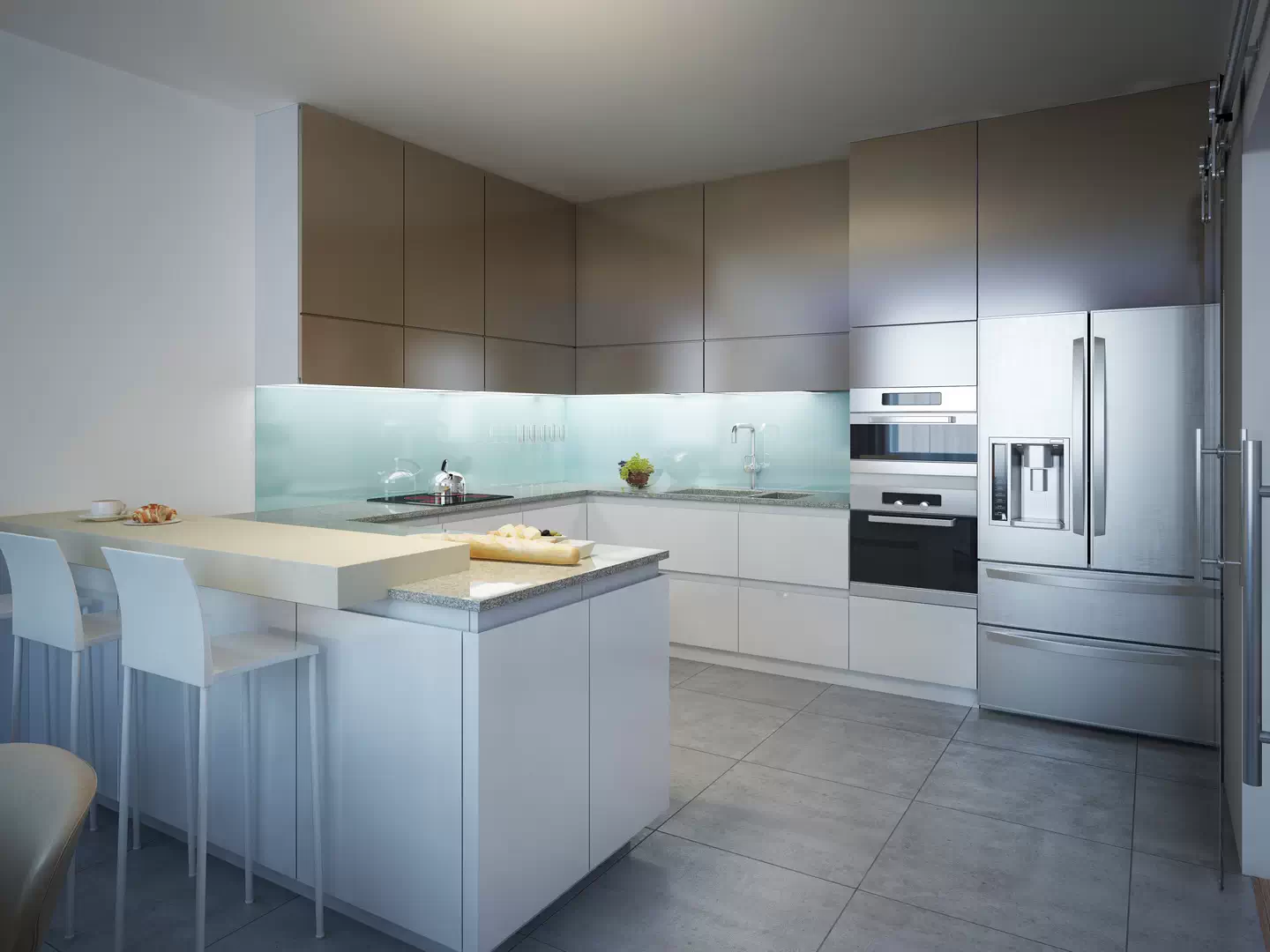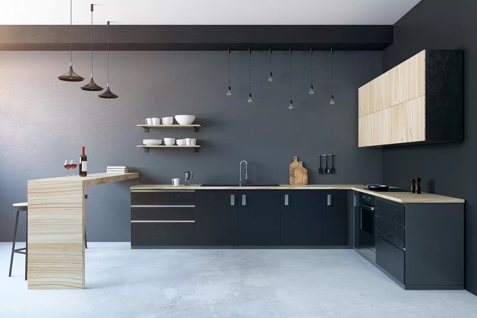 Одна часть такой конструкции примыкает к стене, а вторая выдаётся вперед и к ней есть подход с обеих сторон. Это может быть продолжение нижнего яруса шкафчиков, стол или барная стойка.