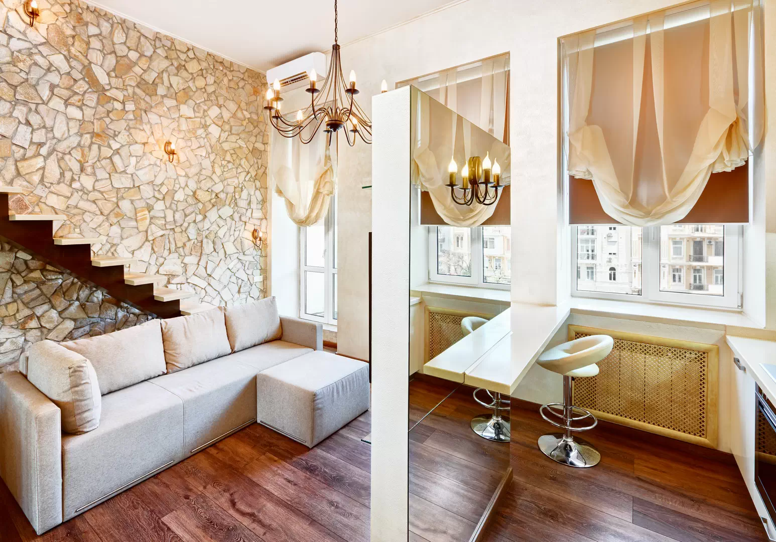 Большую часть стен отделали кремовой декоративной штукатуркой. Акцентную стену в гостиной выложили камнем, в спальне – оклеили коричневыми обоями. Потолок подвесной. На полу ламинат с текстурой тёмного дерева. Мебель в светлых тёплых оттенках.