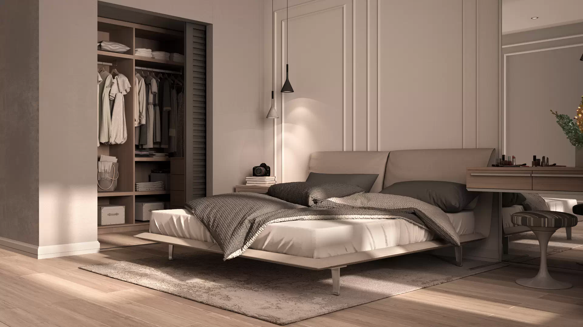 Сама спальня выполнена в стиле неоклассика. Стены покрасили в насыщенный бежевый, задекорировали молдингами. Потолок тоже бежевый – натяжной со встроенными спотами. На полу ламинат под светлое дерево. Прикроватную тумбу и навесной туалетный столик выполнили в одном дизайне. У окна установили широкое зеркало в пол. Вместо классических торшеров или бра использовали современные подвесные светильники. Кровать выбрали на тонком основании с мягким изголовьем.