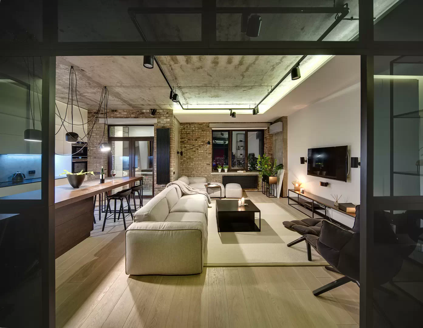 Квартира выполнена в стиле лофт. Часть кирпичной кладки и потолок остались в первозданном виде. Их лишь обработали специальными растворами, чтобы не осыпались и не загрязнялись. Мебель крупногабаритная, в белом, сером и чёрном цветах с обилием металлических деталей.