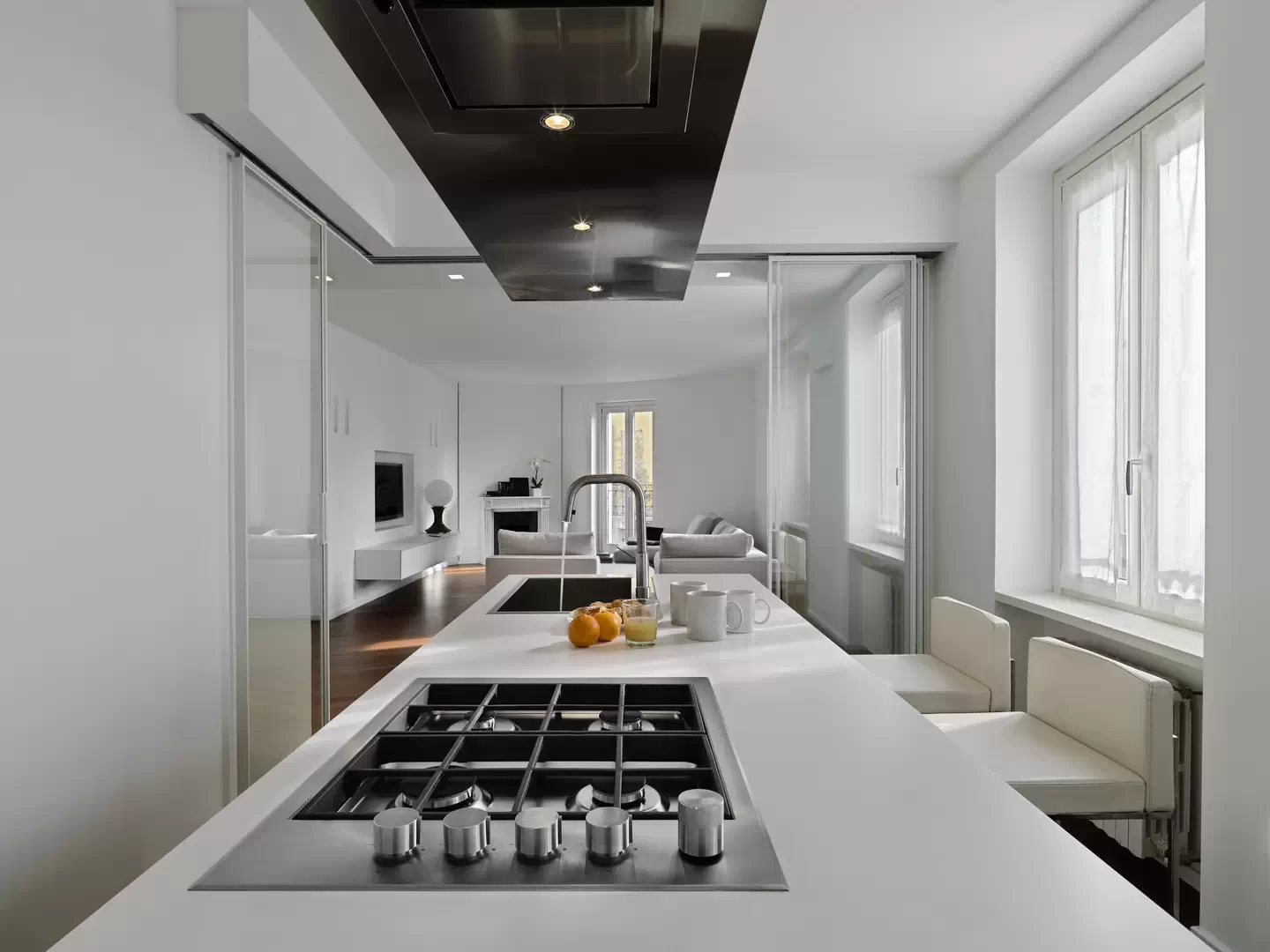 Чтобы оставить больше воздуха и простора, в этой квартире решили отделить кухню от гостиной раздвижной стеклянной перегородкой. Холодильник, духовой шкаф и микроволновку встроили в высокие шкафы-пеналы. Мойку и газовую варочную поверхность вмонтировали в остров с барной стойкой.