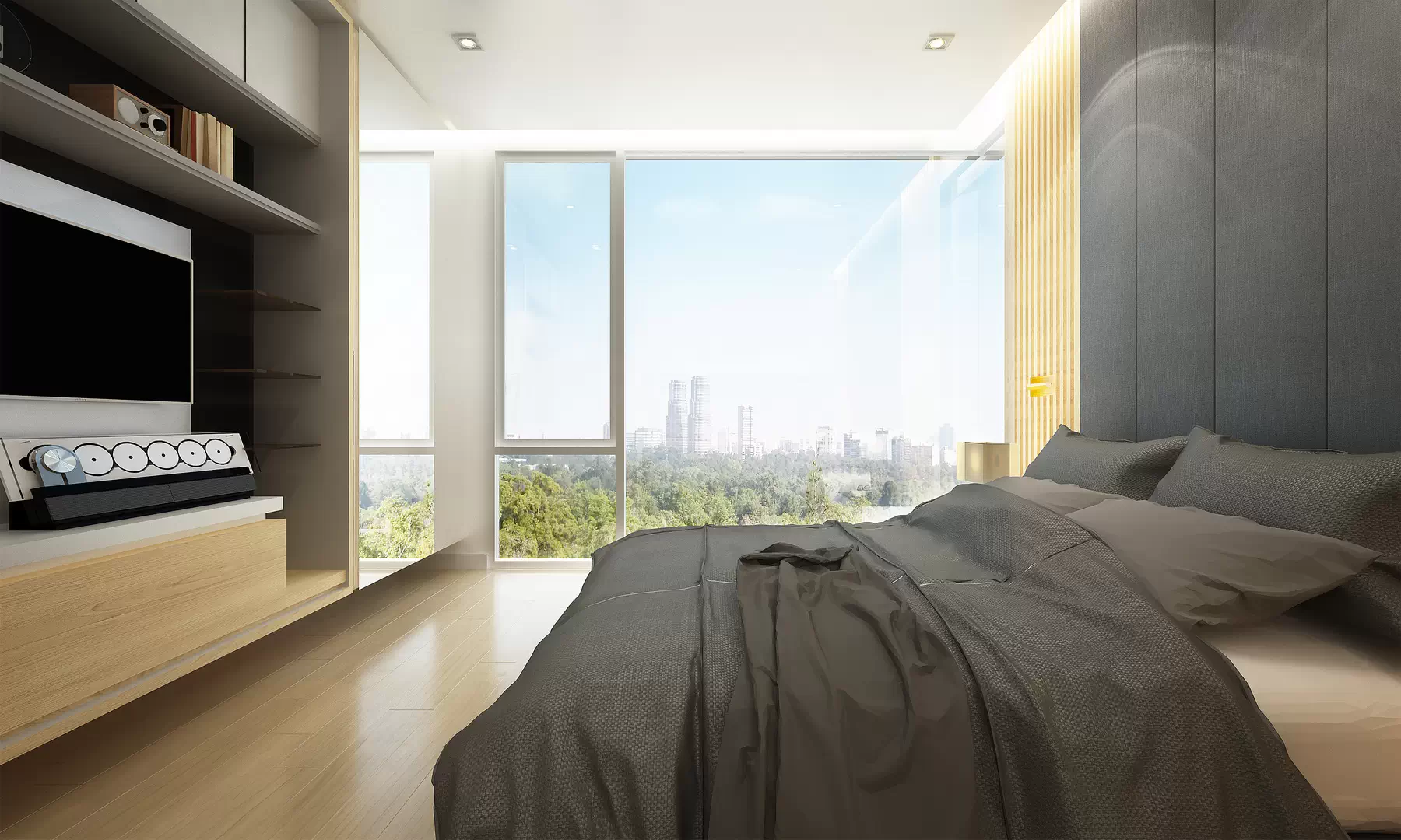 Оттенок дерева повторили в рейках на стене по обе стороны от мягкого серого изголовья кровати. Оно вместе с рейками уходит за парящий потолок, что делает комнату выше.