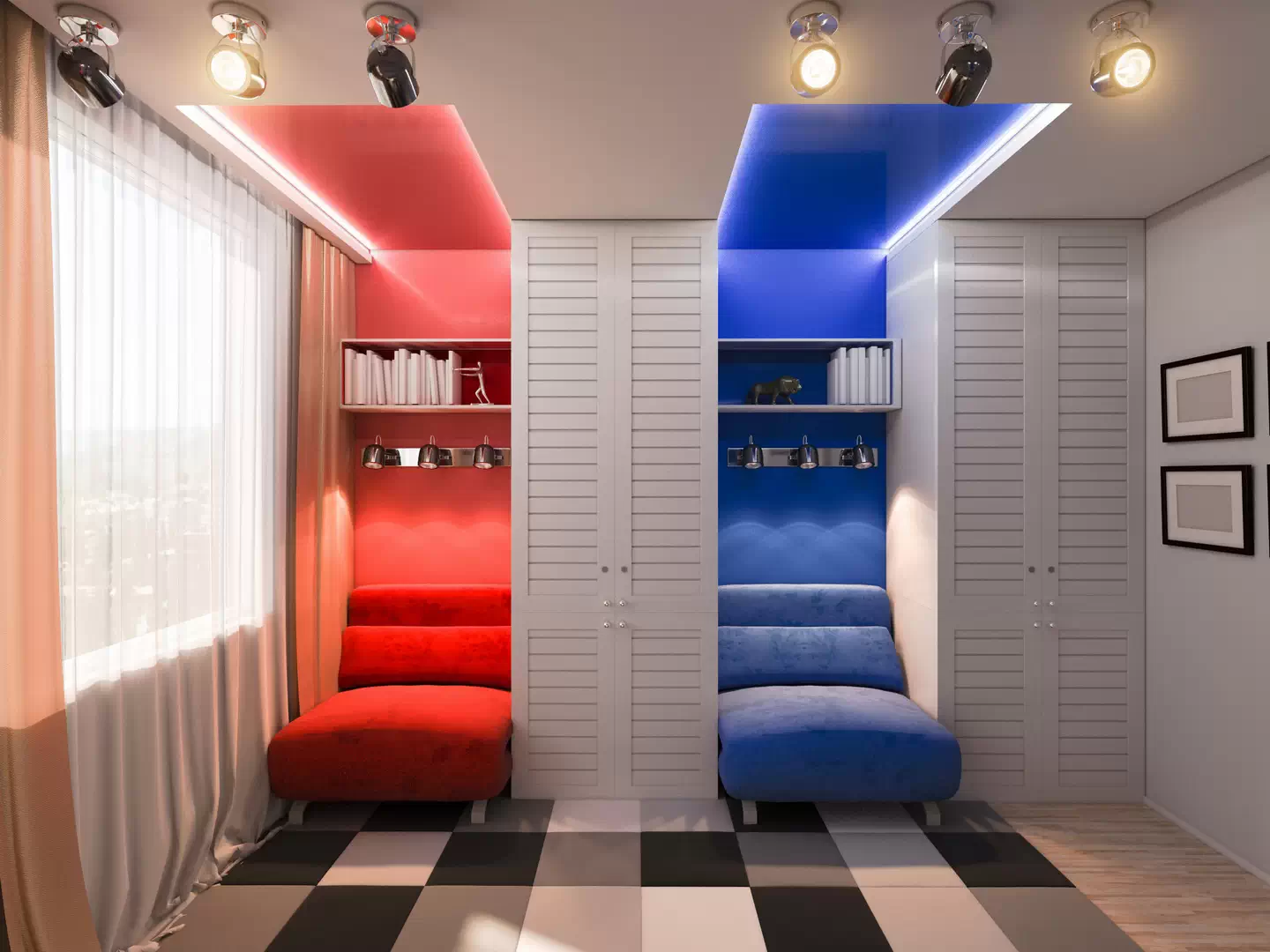 Спальные места выделили символичными для разных полов цветами – красным и синим. Яркие оттенки перенесли со стен на участки с глянцевым натяжным потолком. Этот приём позволил вытянуть пространство вверх. На поднятие высоты комнаты работают и высокие платяные шкафы.