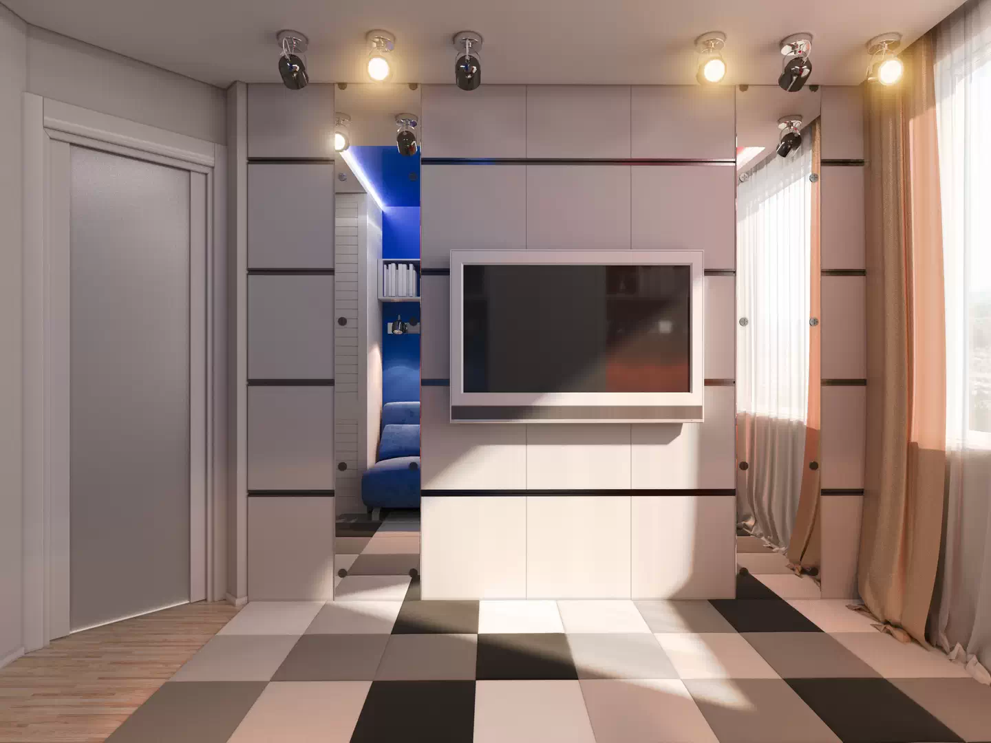 Стена напротив кресел-кроватей поддерживает хай-тек направленность интерьера. Её зашили белыми квадратными стеновыми панелями, которые разделили горизонтально полосами из металлического профиля, а вертикально – зеркалами с большими шляпками-крепежами. Декор этой стены позволяет сделать детскую визуально шире и выше, что очень важно для маленькой комнаты.