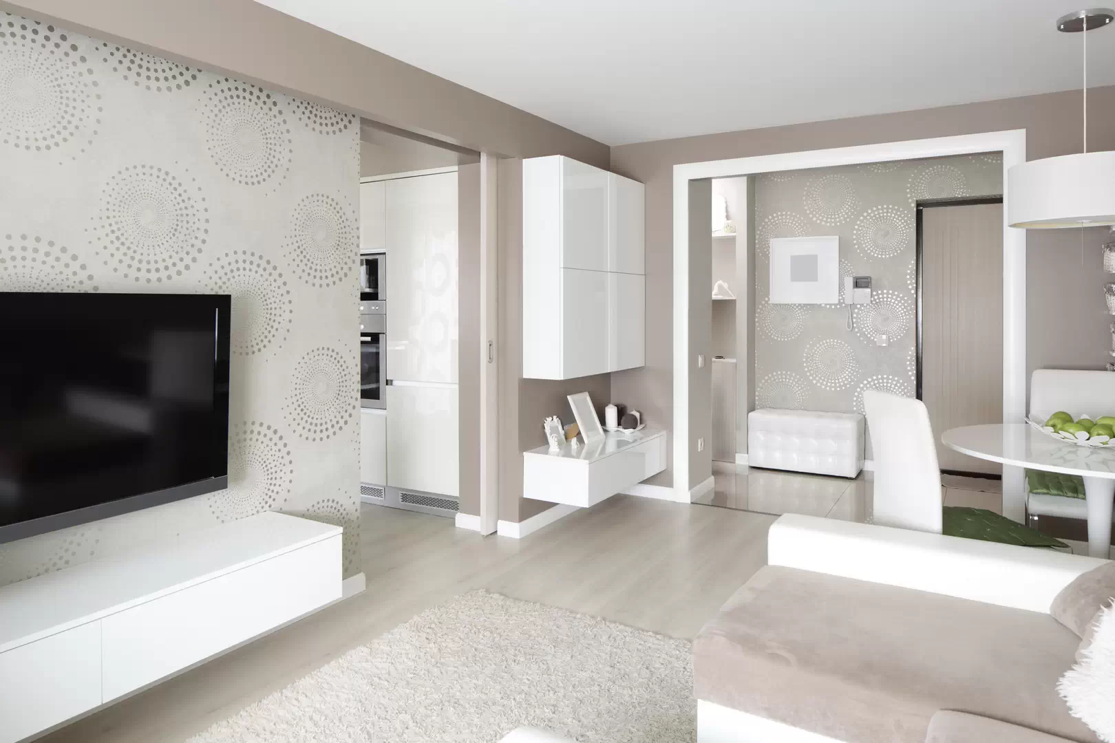 Квартира выполнена в стиле контемпорари. Стены оклеили обоями нежно-коричневого и серого цвета, некоторые участки выделили крупным рисунком. Корпусная мебель с белой глянцевой поверхностью. Обивка дивана в тон стен.