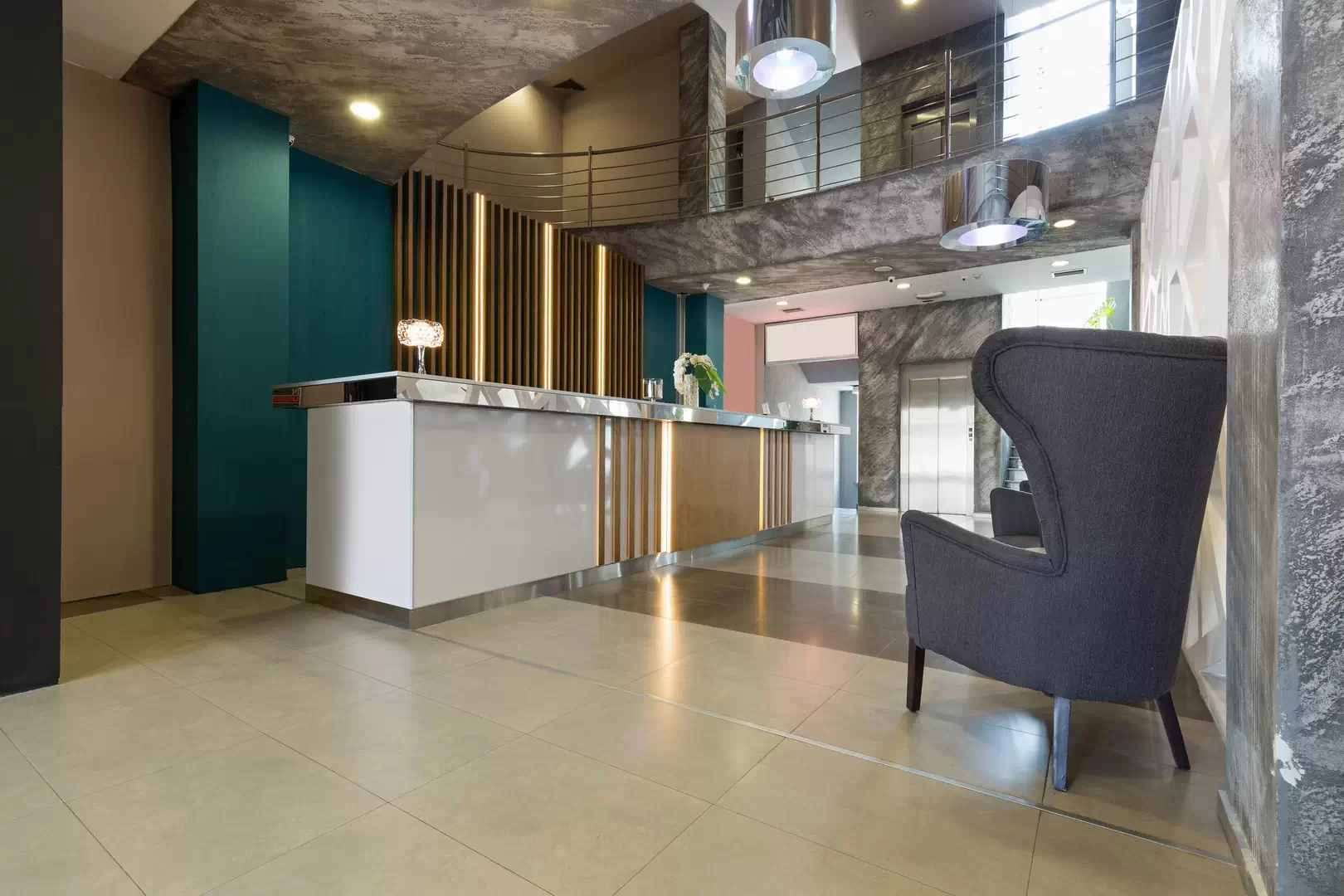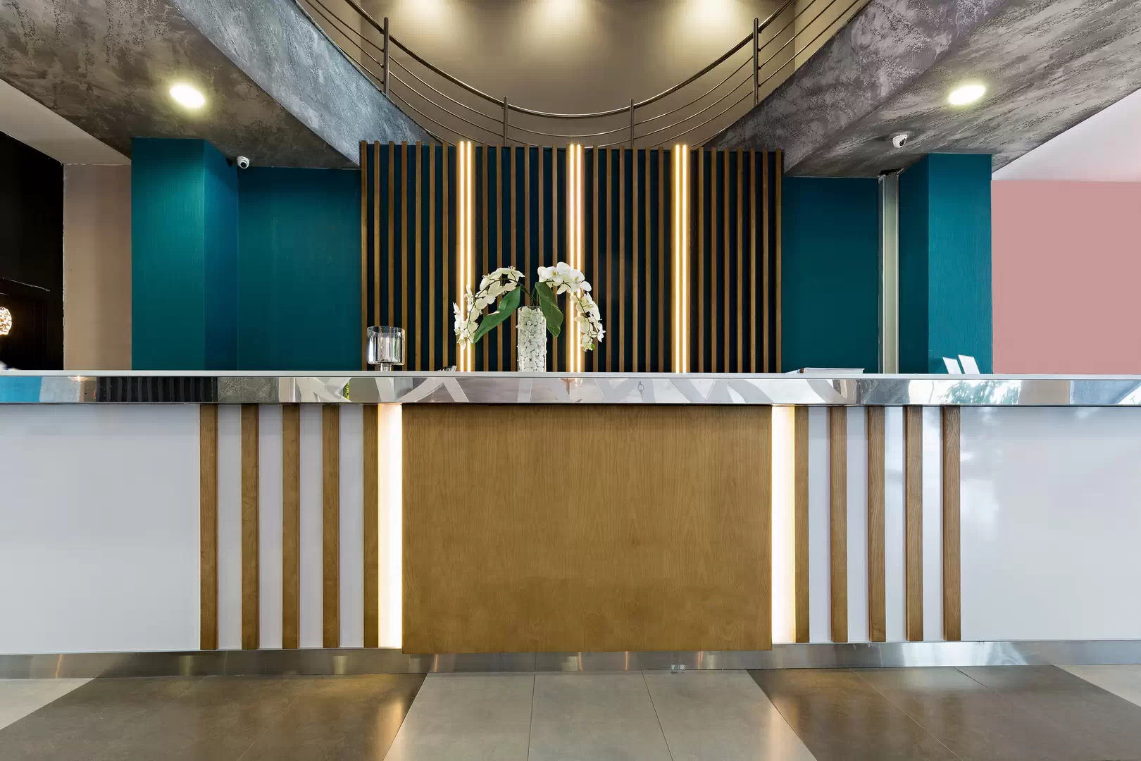 Рецепцию в этом отеле сложно не заметить. Белую глянцевую стойку с серебряным окаймлением разместили на ярком фоне.
