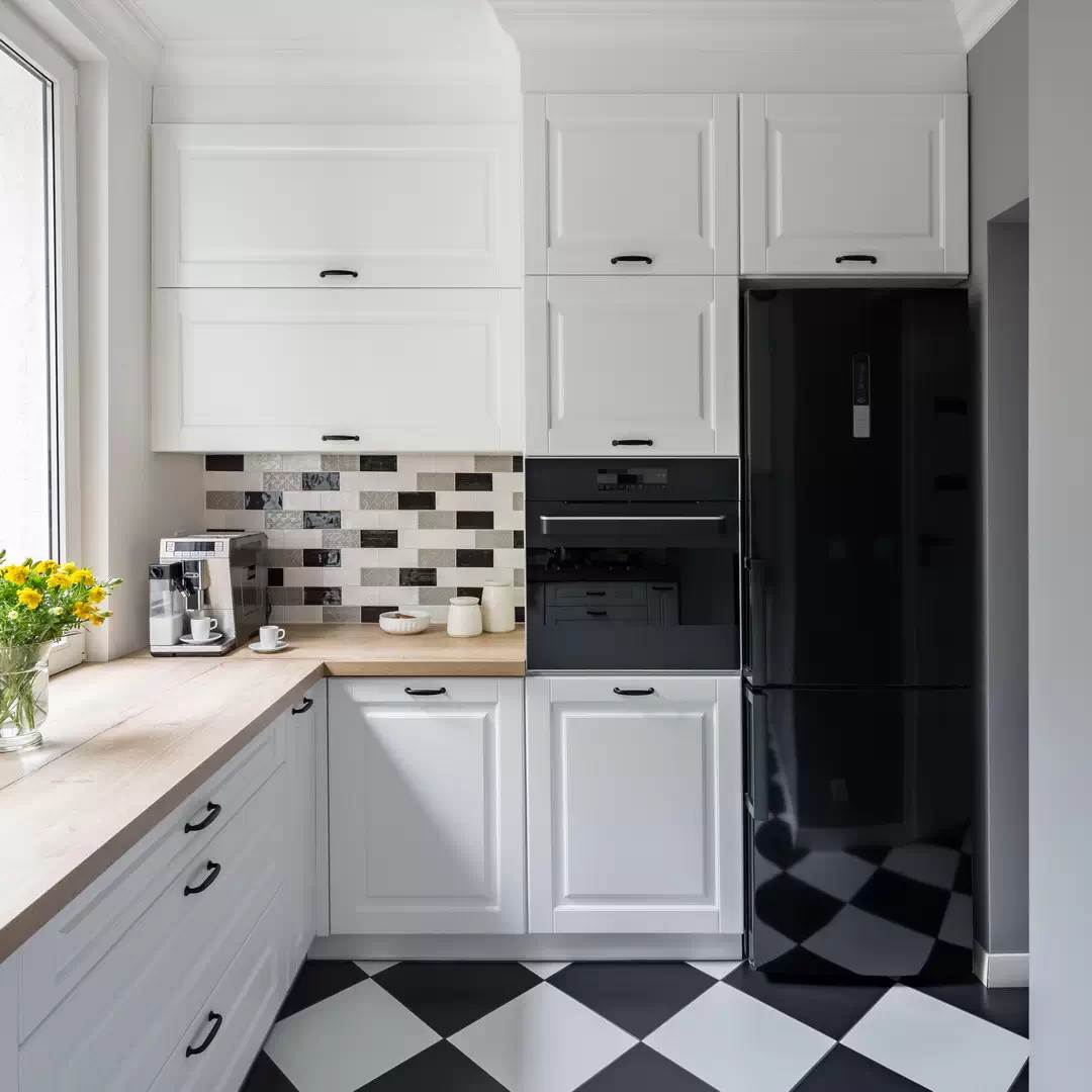 Сочетание чёрного и белого повторилось в шахматной раскладке плитки на полу. На фартуке добавился серый цвет. В него покрасили свободную от кухонной мебели стену. Открытые участки у окна в белой моющейся краске. Стены и мебель с потолком связал высокий классический плинтус.