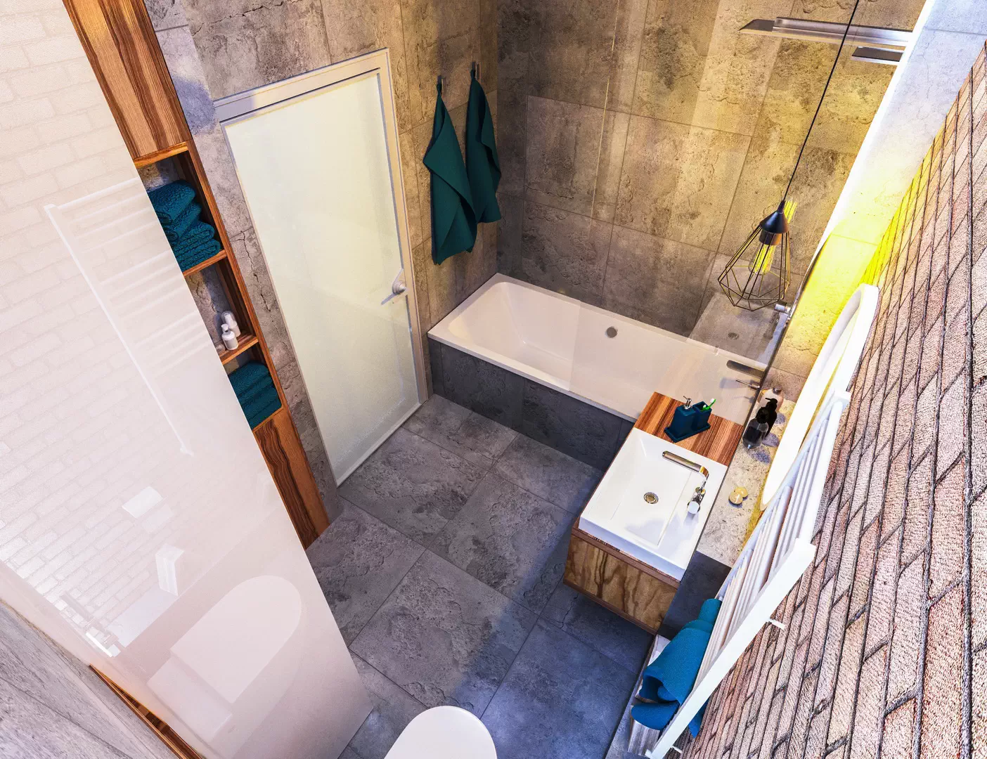 Этот проект совмещённого санузла выполнен в стиле лофт. Тёмно-серая керамическая плитка под камень легла на пол и стены. Одну стену сделали акцентной, задекорировав её кирпичом. Под потолком и за коробом подвесного унитаза пустили подсветку – она создаёт атмосферу расслабления при приёме ванны.