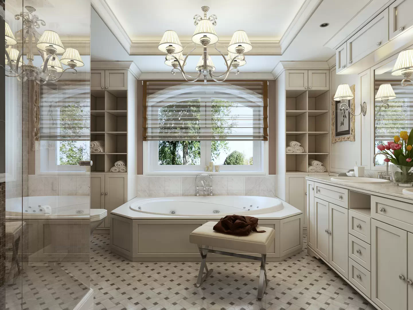 В комнату в классическом стиле вписали современное джакузи, большую стеклянную душевую кабину и подвесной унитаз.